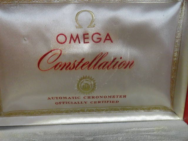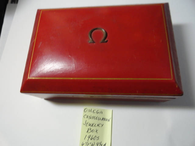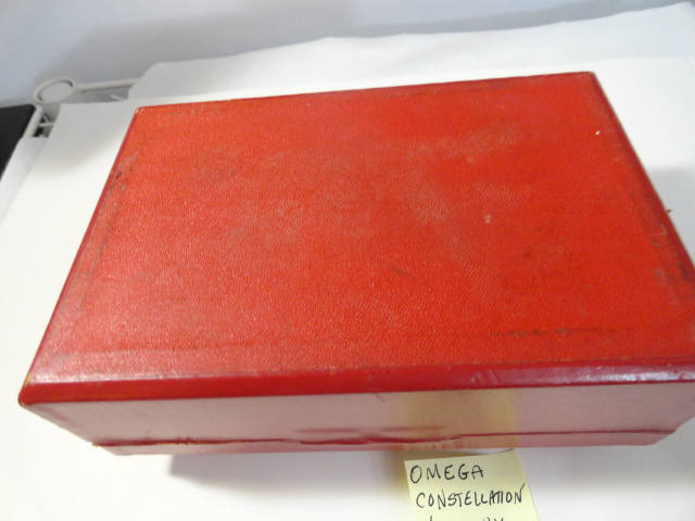 Vintage 1960s Omega Constellation watch jewelry box. Missing the watch holder. 6 1/2 inches wide 4 1/4 inches deep 2 3/4 inches high. Good condition with some minor nicks around the